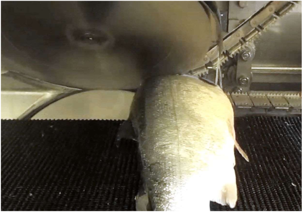 This is a V-shaped head cutter that cuts the head of salmon precisely and efficiently.