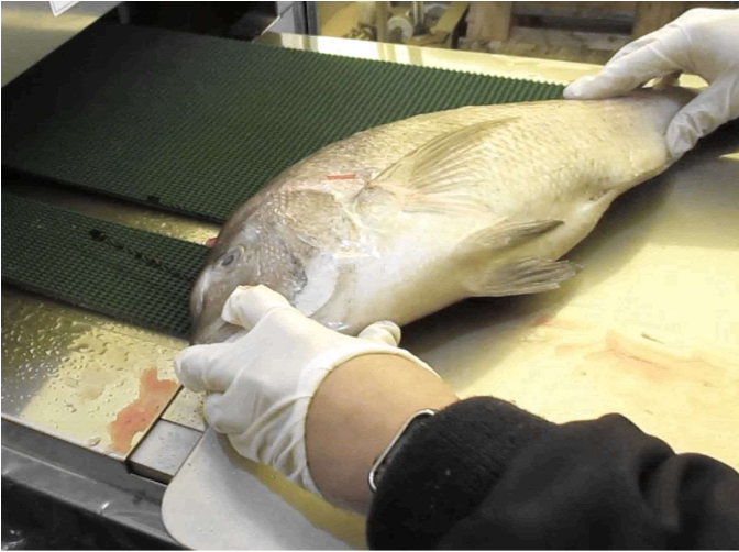 - ●A machine that cuts the head of sea bream into a V shape for high yield.