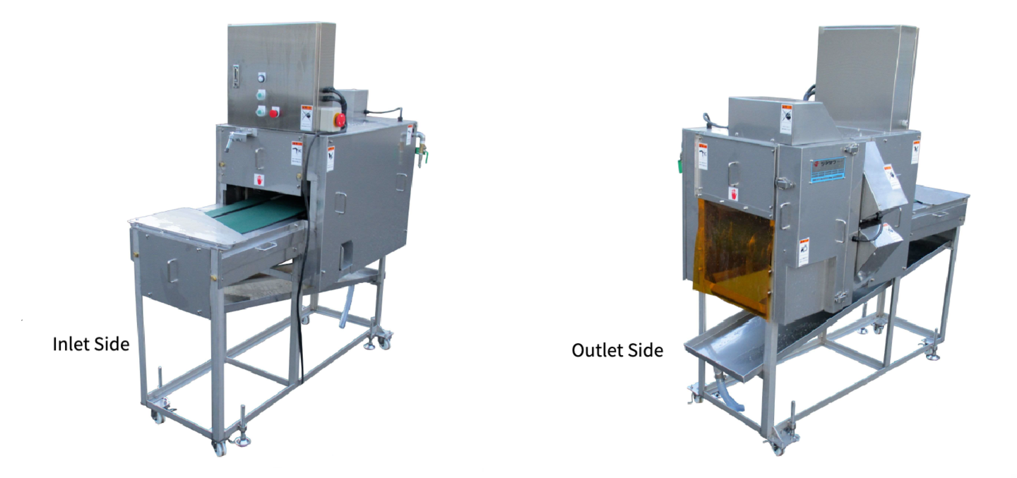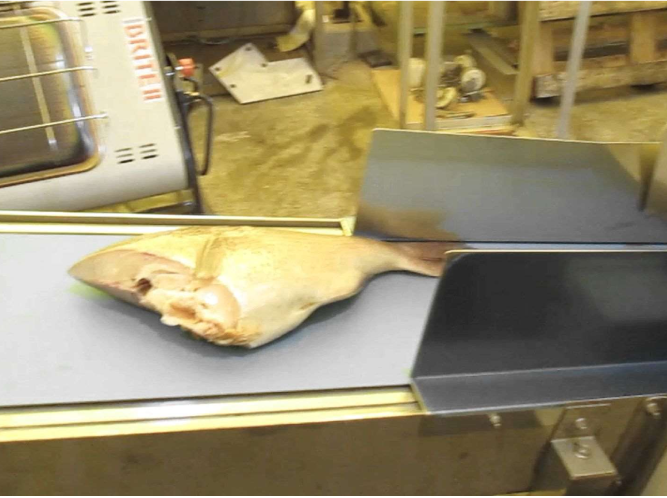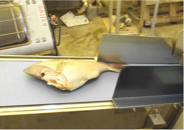 - ●Place the raw pectoral fin on the entrance guide and push it forward for processing.