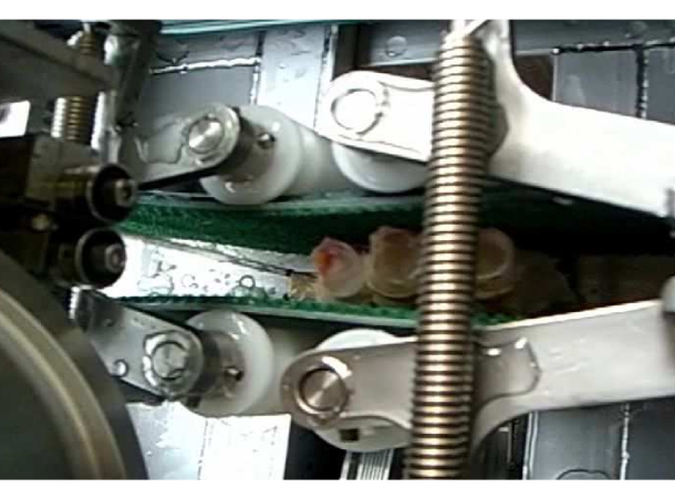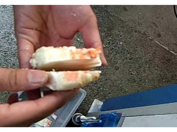 Using a bandsaw blade, it precisely cuts frozen crab shoulder meat in half from the center.