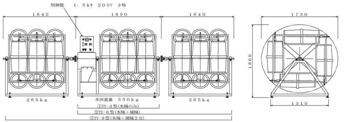 Approx. 900 kg (TY-9: main + 2 auxiliary units) - ● Materials: Stainless steel 304 (main body), Brass (spindle), Butyl rubber (barrelpacking)