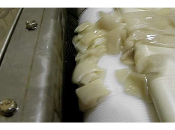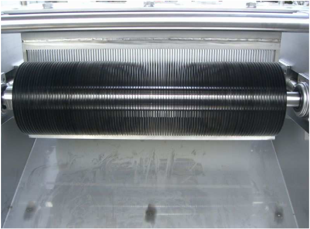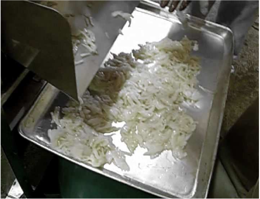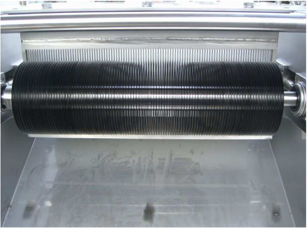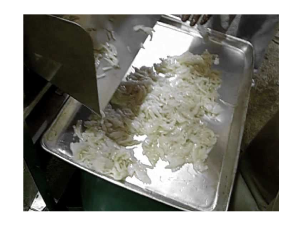 - ●Simply drop the raw material between the circular blades and grooved drum for cutting.