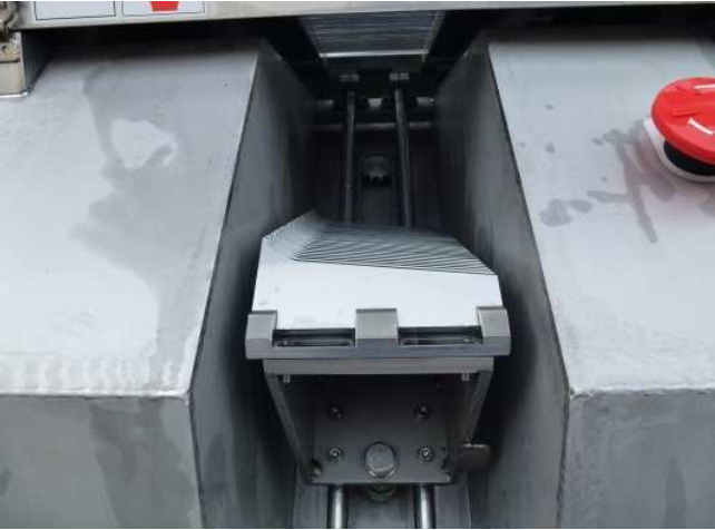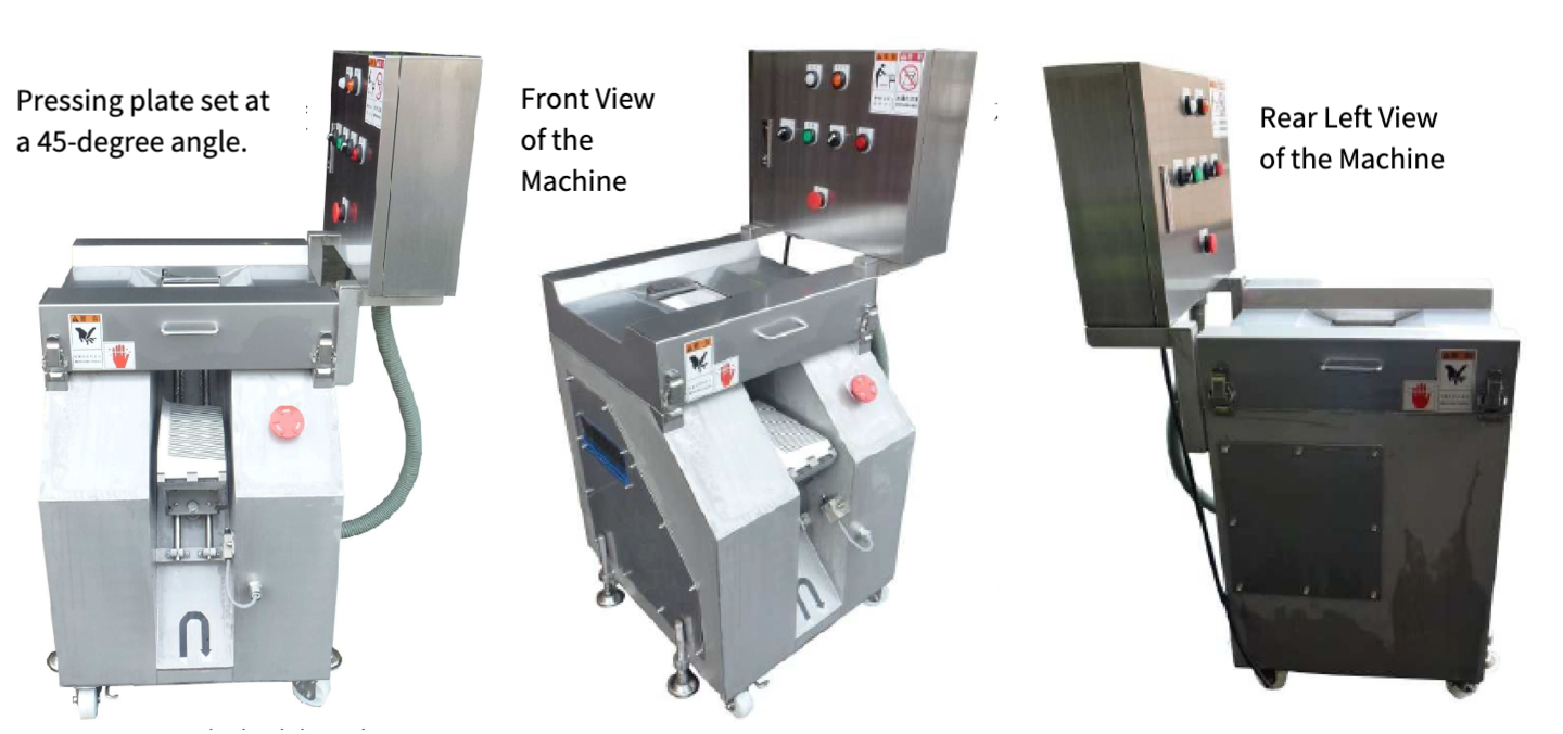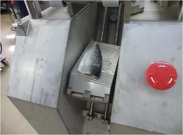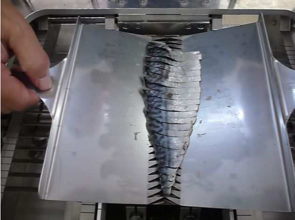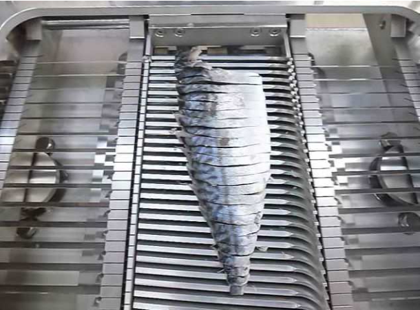 It is a pusher-type slicing machine suitable for processing fish and chicken.