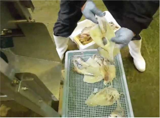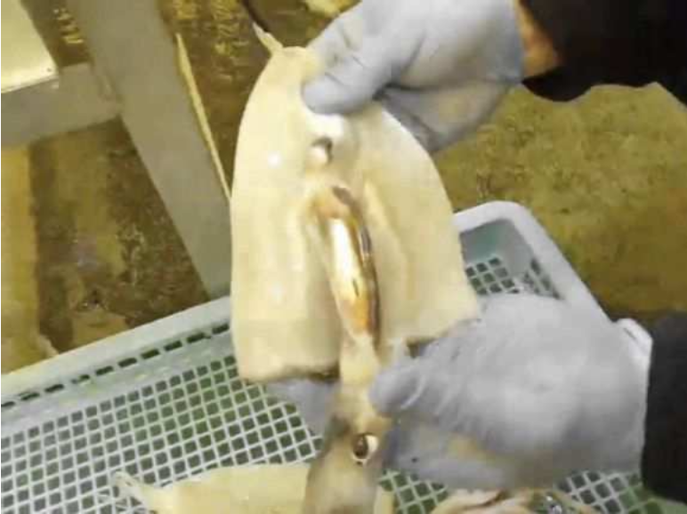 - ●イカの内臓にキズをつけずに丸刃で美しく開き加工
