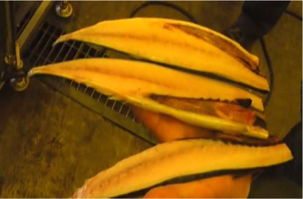 中型魚の三枚卸を毎分最大100尾処理可能。